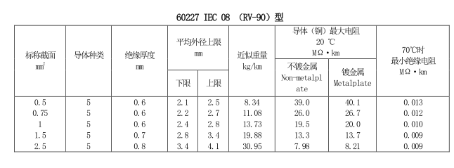 內部布線用導體溫度為90℃的單芯軟導體無護套電纜