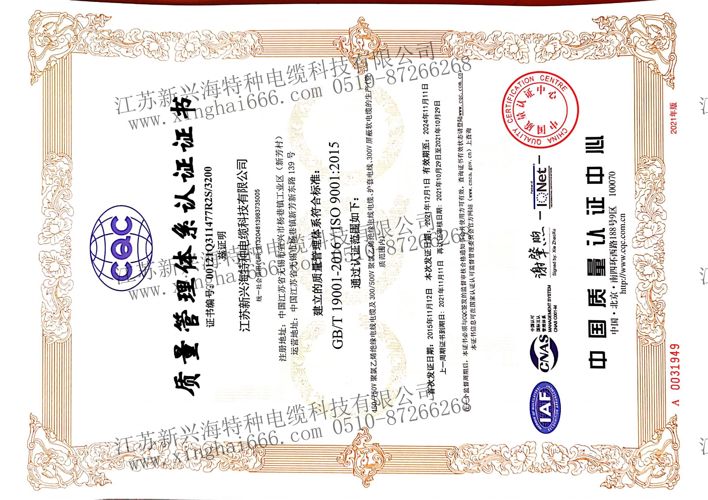 質量體系管理證書-江蘇新興海
